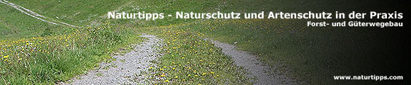 | • | Wege möglichst wenig befestigen und nicht asphaltieren. Wasserdurchlässige und naturnahe Beläge verwenden, zB Kies- und Schotterwege anlegen, noch besser sind Erd- oder Graswege. Fußwege können an feuchten Stellen als Knüppelwege mit Stämmen und Ästen befestigt werden. Unebenheiten und Pfützen auf dem Weg belassen, nicht auffüllen. Auf den Mittelstreifen unbefestigter Wege gedeihen oft besondere Pflanzen, Radspurtümpel dienen Gelbbauchunken als Laichgewässer. Auch bei stark belasteten Wegen ist oft keine geschlossene Asphaltdecke nötig, meist reichen zwei Betonspuren. Naturwege beeinflussen das Mikroklima weniger, Zerschneidungs- und Barriereeffekte sind ebenso wie die Auswirkungen auf das Landschaftsbild geringer. Mit zunehmendem Grünanteil steigt die Bedeutung des Weges als Lebensraum. Durch Auflockern des verdichteten Bodens (zB durch eine Steinfräse), falls notwendig in Kombination mit einer ergänzenden Ansaat, kann die Entwicklung eines begrünten Mittelstreifens gezielt gefördert werden. |
