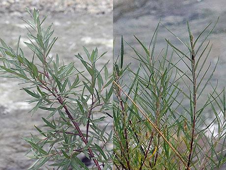 In der freien Landschaft, zB am Ufer von Fließgewässern, sollten keine Zuchtformen verwendet werden. Die Lavendelweide (Salix eleagnos) (links) wächst vor allem an Bergbächen; die Rosmarinweide (Salix eleagnos angustifolia) (rechts) ist eine Zierform, die durch schmale und lange Blätter gekennzeichnet ist.