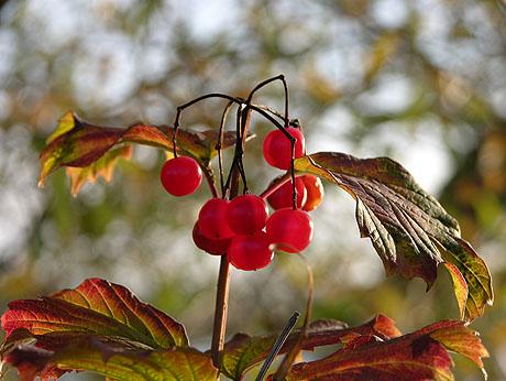 Der Gewöhnliche Schneeball (Viburnum opulus) meidet trockene Böden. Er wächst häufig in Auwäldern und an Bächen, an feuchten Waldrändern und in Hecken. Die roten Früchte sind leicht giftig. Selbst von Tieren werden sie so lange verschmäht, bis sie durch Frost genießbar wurden oder beliebtere Nahrung fehlt. |