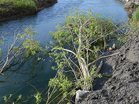 Raubäume sichern Ufer, schaffen Unterschlupf für Fische uns sorgen durch für unterschiedliche Strömungsgeschwindigkeiten für Lebensraumvielfalt im Gewässer.