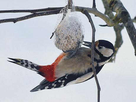 Meisenknödel sind eine gute Ergänzung zum Körnerfutter und werden auch gerne von Buntspechten aufgesucht.
