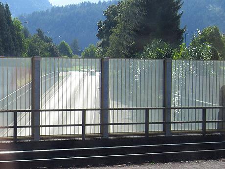 Senkrechte, etwa 2 cm breite Streifen im Abstand von höchstens 10 cm schützen wirksam vor Vogelschlag. Im Bild ein positives Beispiel einer Lärmschutzwand, die durch ein Steifenmuster entschärft wurde. |