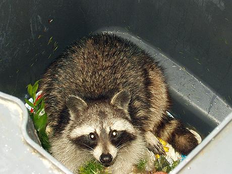 In Städten sorgen Mülltonnen und Komposthaufen für ein reiches Nahrungsangebot für Wildtiere. Der nordamerikanische Waschbär hat längst viele Gärten und Hinterhöfe erobert. |